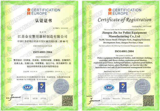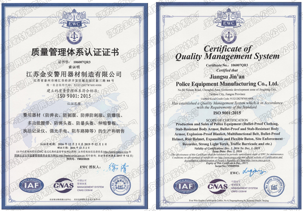 第一批新型單警裝備定點生產(chǎn)企業(yè) 公安部警用裝備采購中心協(xié)議供貨單位 公安部防彈防刺服生產(chǎn)定點企業(yè) 江蘇省公安廳防彈衣入圍企業(yè) 江蘇警用裝備行業(yè)協(xié)會會員單位 中國刑事科學(xué)技術(shù)協(xié)會團(tuán)隊會員單位 中國安全防范產(chǎn)品行業(yè)協(xié)會會員單位 靖江市保安器材行業(yè)協(xié)會常務(wù)理事單位 全國警用裝備標(biāo)準(zhǔn)化技術(shù)委員會通訊委員 江蘇金安警用器材制造有限公司始創(chuàng)于九十年代初,公安部防彈防刺服生產(chǎn)定點企業(yè)、公安部警用裝備采購中心2..